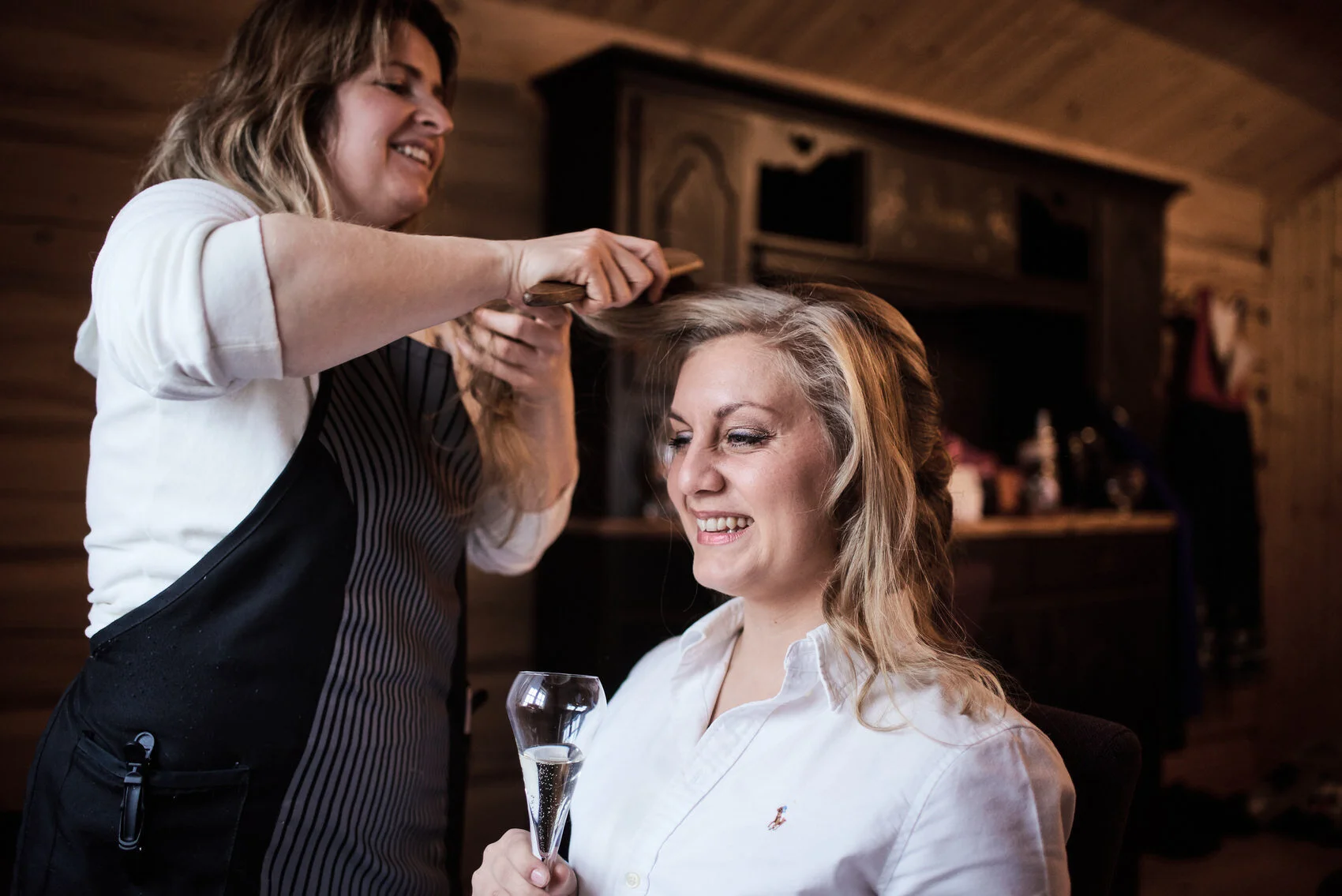 Kathinka hadde samlet forlover og venner i en av hyttene, der kom også manna og pappa etterhvert for å hjelpe på med kjolen og få alt klart til vielsen.
